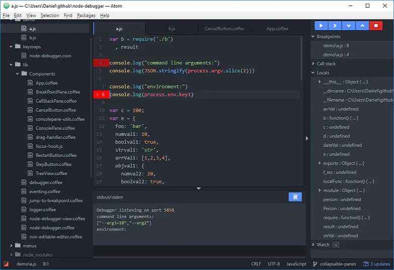 至於 Atom,就我知道的來說,Node.js、Go 都有還算不錯的 debugger 套件,但因為先天設計沒有將 debugger 考慮進去的關係,各個套件的操作體驗會有所差別。