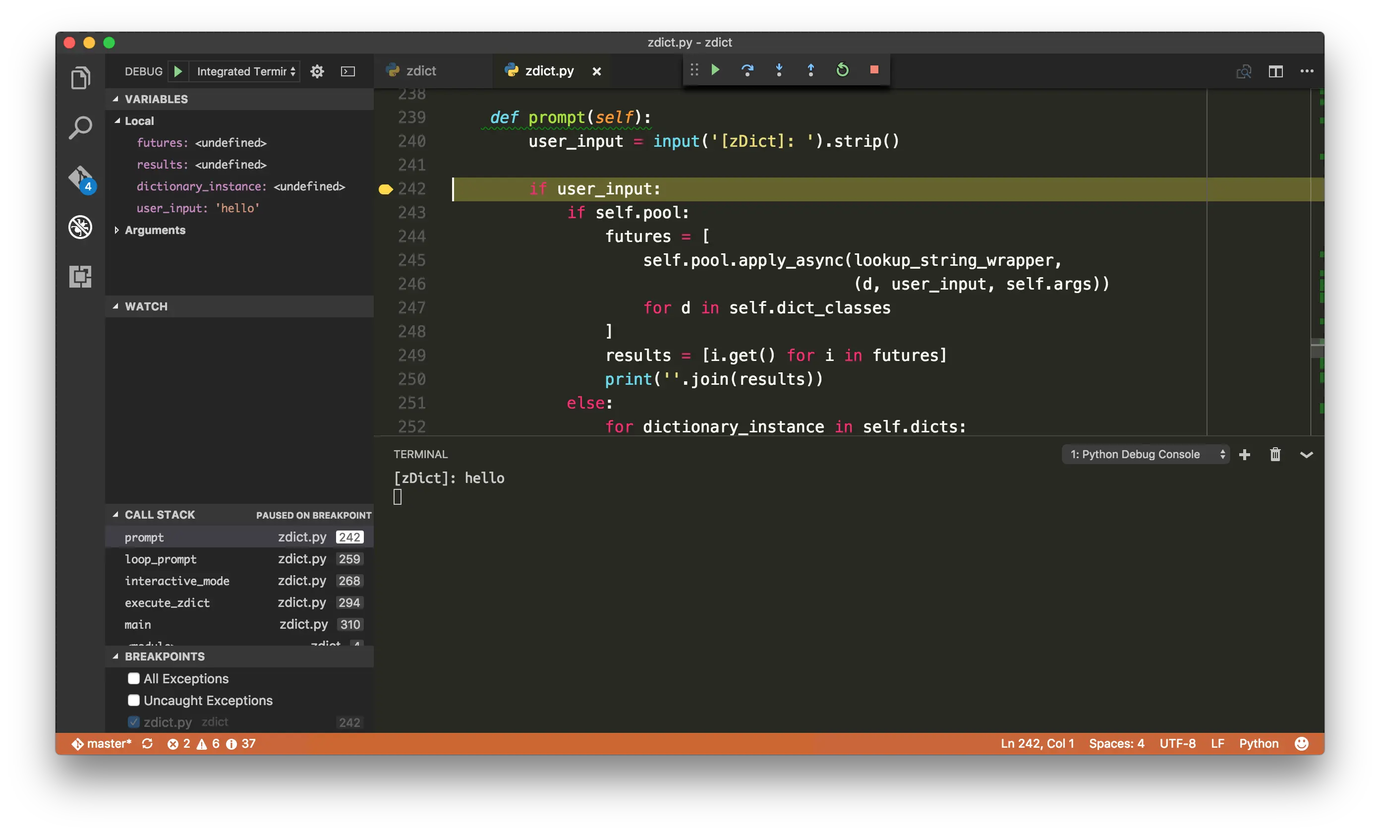 前面就有提過,我認為 debugger 框架是 VS Code 一大殺手級功能。在 debugger 介面上可以瀏覽當前變數的值,查看 call stack,而中斷點的部分依據套件不同甚至支援了 conditional breakpoint(條件成立時才觸發)。