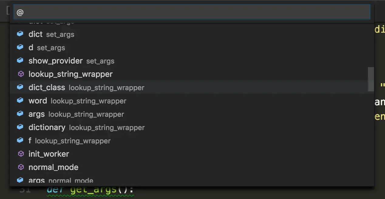 接著是許多 Editor 都具備的功能,可以快速切換到特定的 symbol。這部分同樣可以透過 icon 的識別是哪種類型的 symbol。