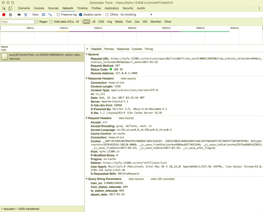 打开调试工具command+shift+j),查看网络,可以看到请求的url,点击这个url可以看到返回一个json,包含了这趟车的时刻信息和其他的一些状态信息