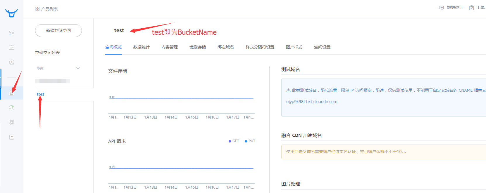 进入七牛-->对象存储中,BucketName即你要上传的图片的存储空间的空间名,创建的空间一个要为公开空间