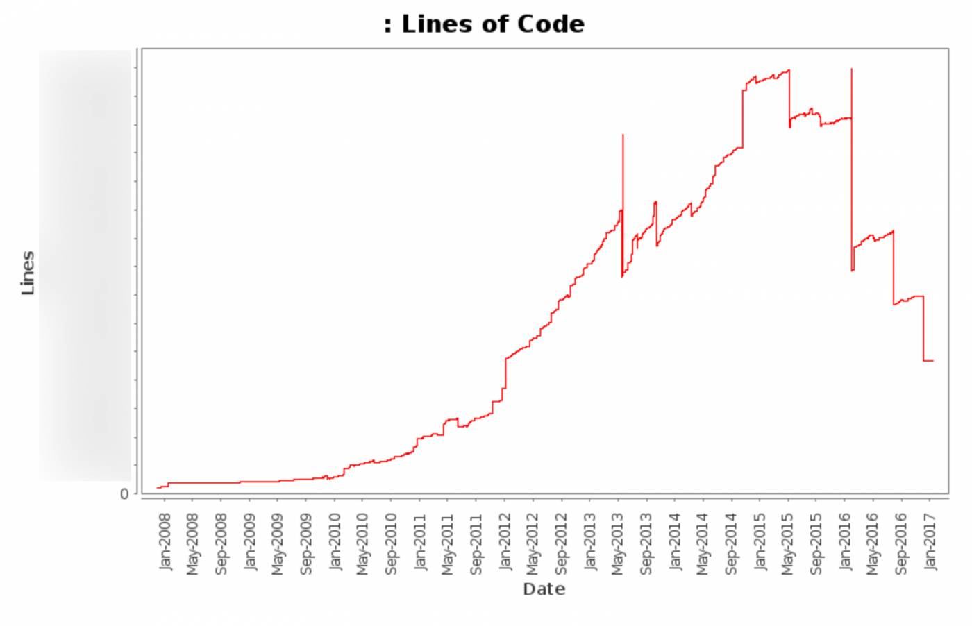 此图显示从2008年到今天的我们的总代码行(不包括各种自动更新的文件)。