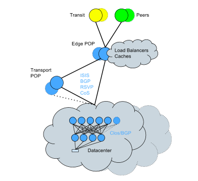 虽然最初的骨干网没有任何形式的流量工程化调度,添加它以帮助我们根据我们的增长而扩展。为了帮助我们,我们完成了角色的分离,以便具有分别专用于核心和边缘路由的分离的路由器。这也使我们能够以高效成本的方式扩展,因为我们不必购买具有复杂边缘功能的路由器。