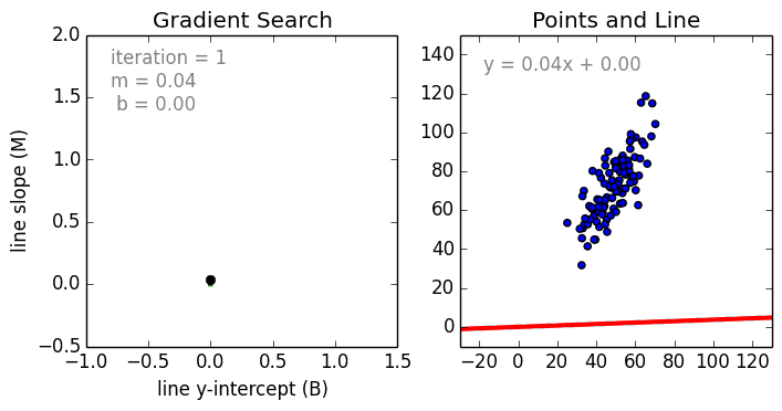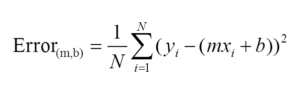 上面公式的含义是:假设点是(x,y),那相同x的直线上的点就是:(x,mx+b),而这两者之间的距离就是(y-(mx+b)),为了防止出现负数,因此我们就计算了平方,有了这个衡量的标准后,我们就可以画出上面公式的一个图了: