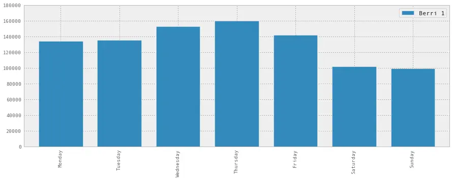 这个数据集是一个列表,蒙特利尔的 7 个不同的自行车道上每天有多少人。