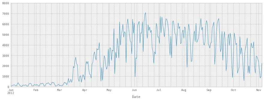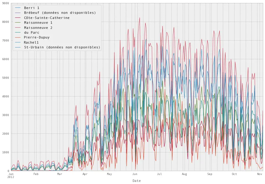 我们将从蒙特利尔(Montréal)寻找一些骑自行车的数据。 这是原始页面(法语),但它已经包含在此仓库中。 我们使用的是 2012 年的数据。