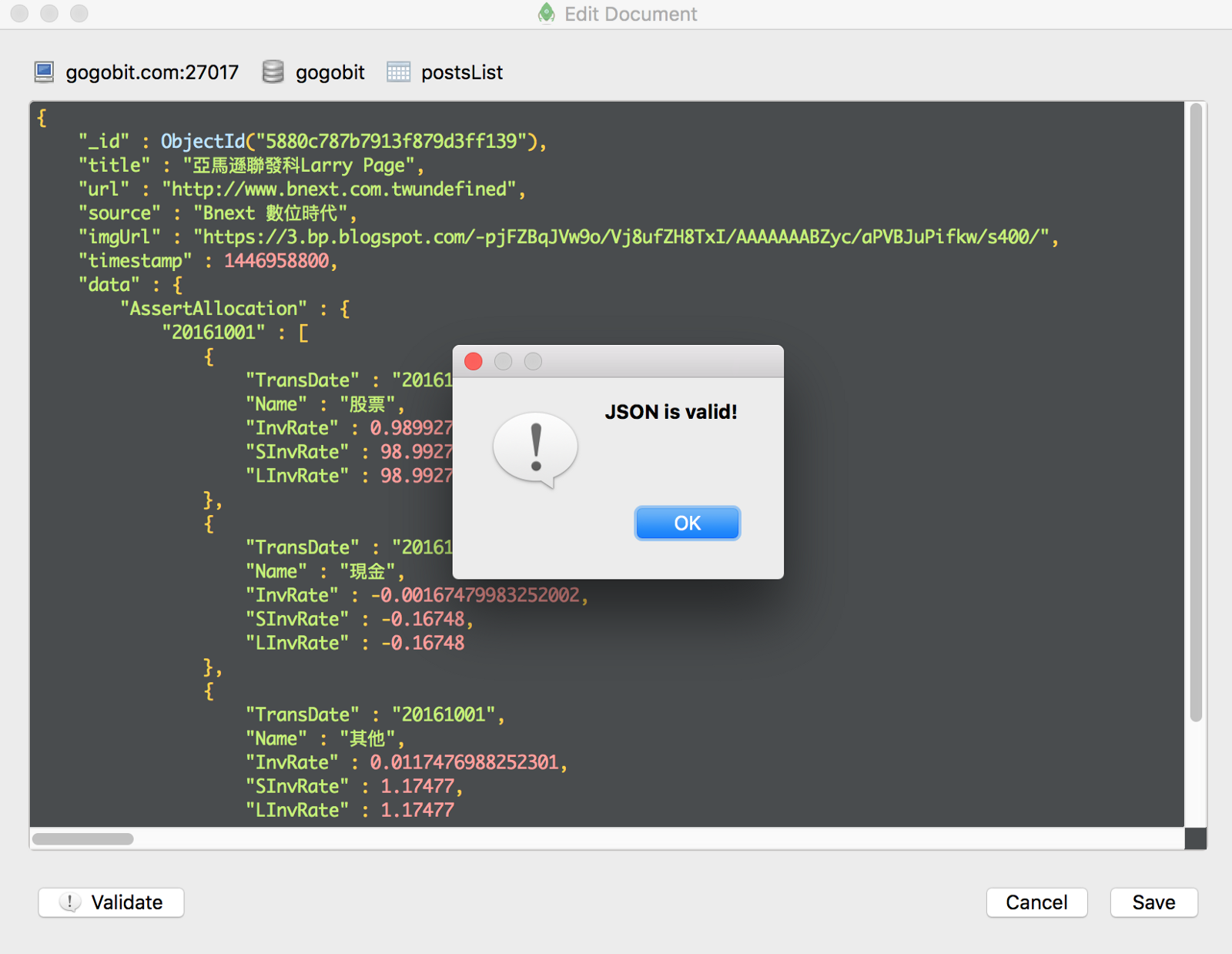 這是我覺得最方便的地方了,在上述綠色的畫面下,右鍵點擊一個 document 就可以選 edit document,進到這畫面可以直接編輯 JSON,更貼心的是左下角有驗證 JSON 格式的選項,可以測試格式正確性。