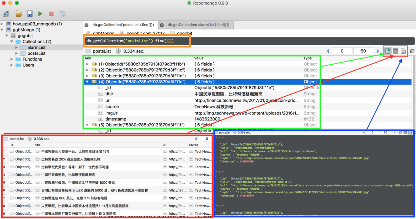 綠色、紅色、藍色分別是它的不同檢視方式,綠色是預設的結構式呈現,可以用滑鼠展開整個 document 的 key-value 結構,紅色是比較像 excel 的呈現,很多人習慣這樣的表示方式,藍色則是我們最 geek 的方式,直接 JSON 結構呈現。