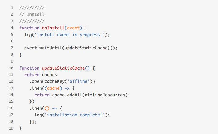 Service worker 在 Register 时会触发 Install 事件,在 Install 时可以用来预先获取和缓存应用所需的资源并设置每个文件的缓存策略。
