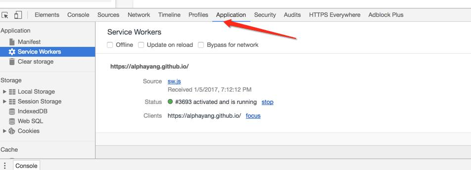 有两种方式进入 Service worker 管理界面来手动 Start 或 unregister。