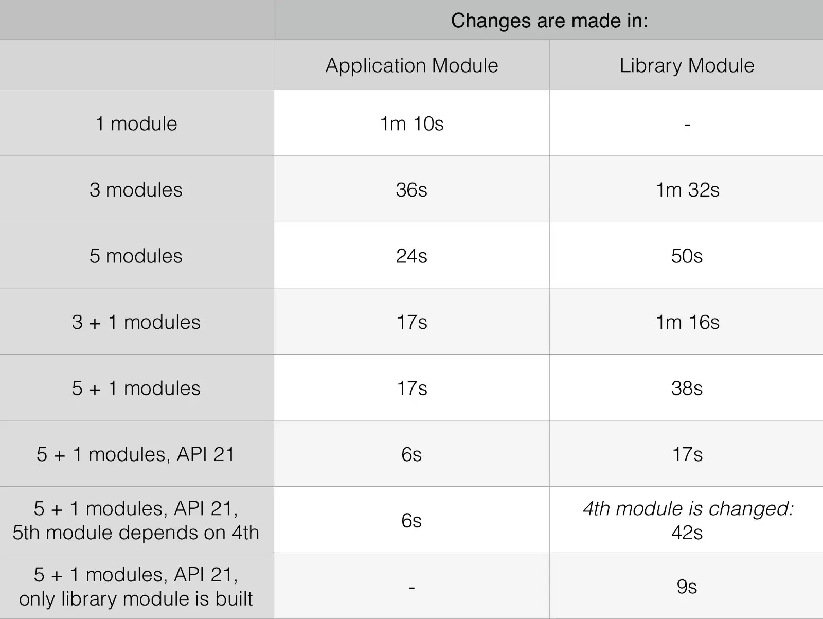 即使是library中改动增量build时间只有17s。但是当所有module依赖于一个module,当被依赖的module更新时,增量build时间从17s增加到42s。