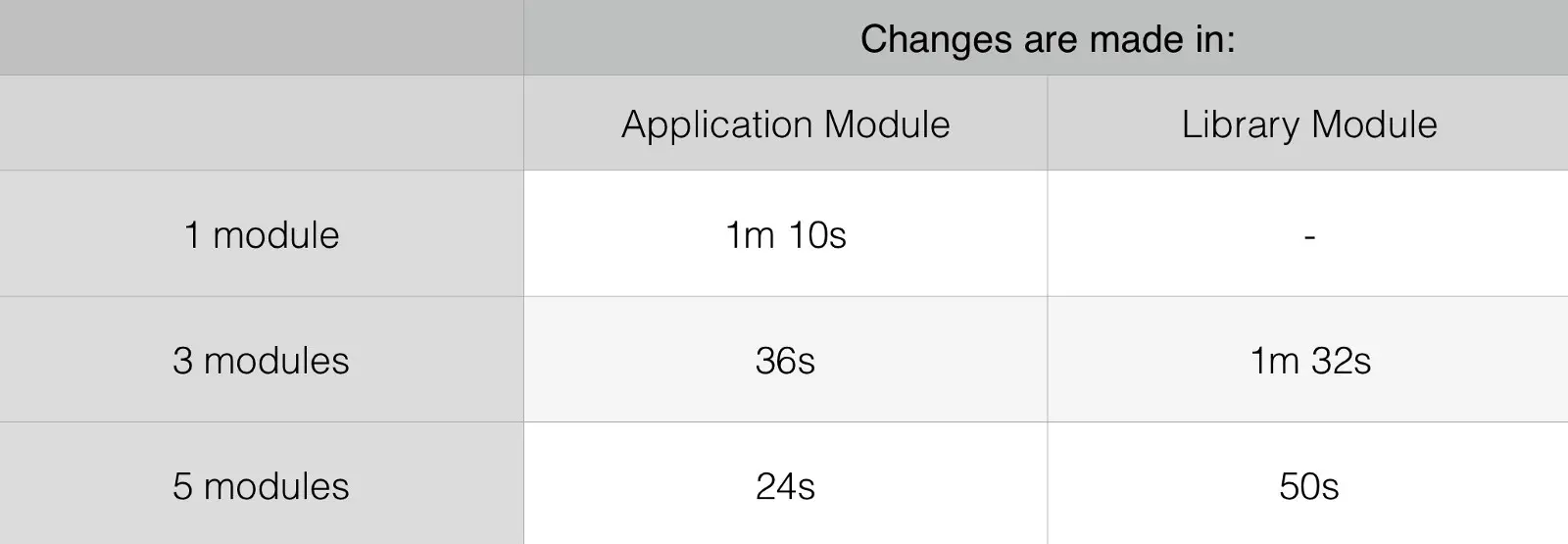 很明显,编译时间依赖于代码数量。如果减少一半的代码,则编译时间可能会降低为之前的一半。如果把3个module变为原来的5个module,编译时间将会减少大约40%左右。