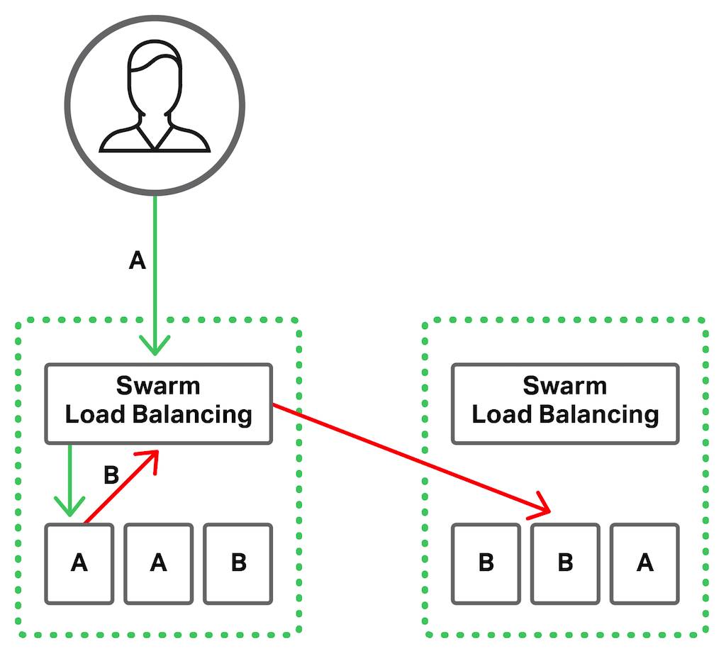 Docker Swarm负载均衡器运行在每个节点上,可以在集群中任何主机上跨容器负载均衡请求。在没有NGINX或NGINX Plus的Swarm部署中,Swarm负载均衡器处理入站客户端请求(由图3中的绿色箭头表示)以及内部服务到服务请求(由红色箭头表示)。