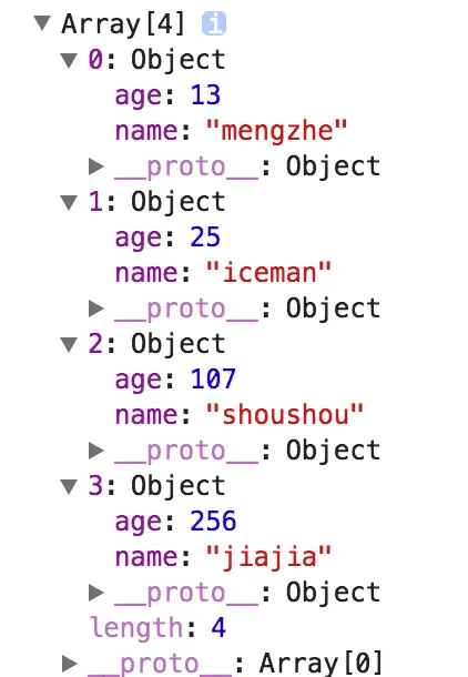对象数组的排序,正常情况都是要求根据某个值为数字的属性来排序,在本例中,我们要求以年龄来排序。