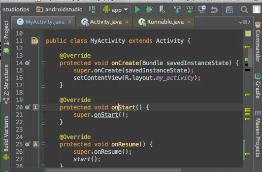 描述:该操作有助于在布局文件和Activity/Fragment之间轻松跳转。这也是一个快捷操作,在类名/布局顶端的左侧。