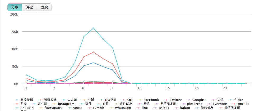 开发者集成分享,当然是希望,可以看到用户的分享行为,关注分享量的增减。接入友盟后,友盟会为您提供专业的数据分析,如下图所示: