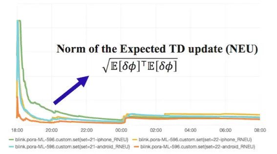 在双11期间,我们在无线搜索排序的21和22号桶对强化学习方案进行了测试。下图展示了我们的算法在学习的过程中的误差(RNEU)变化情况,截取的时间范围为11月10日18:00到11月11日8:00。