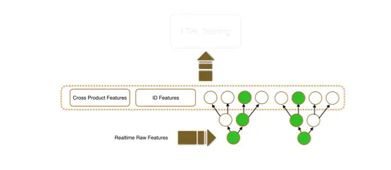 第二部分是来自于match阶段的一些连续类特征。推荐的match阶段负责粗选出一部分跟用户相关的content,该过程中会有多个模型分出现,例如做trigger selection的model分, content的最终match score等,这些分数来自于不同离线model,最终作为feature在online rank model中,能获得非常好的ensemble效果。