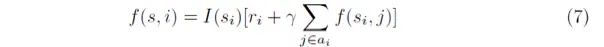 我们把这一定义延伸到典型的多商品推荐场景。由于文章长度有限,我们下面介绍一种最简单的思路,即假设用户是否会点击单商品的决策是独立的。也就是说,假设用户如果喜欢商品A,用户不会因为在同一推荐列表中见到了他更喜欢的商品B而放弃点击商品A。在这一假设下,我们对展示每个商品所获得的累积奖励的计算也是独立的。通过一系列的推导,我们可以得到一个对状态s下商品i能得到的分数f(s,i)的递归定义。