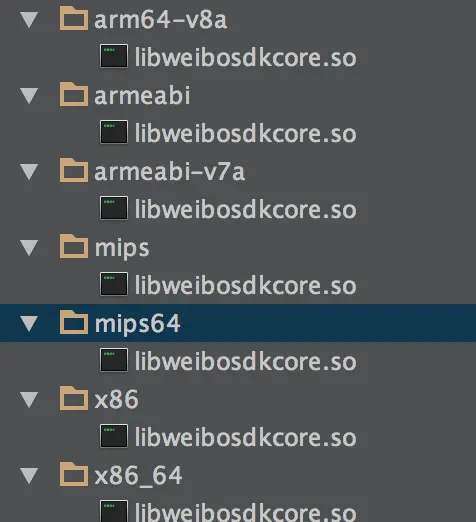 每种架构关联着一种ABI(application binary interface应用程序二进制接口),所以每一种架构都对应一个.so文件。