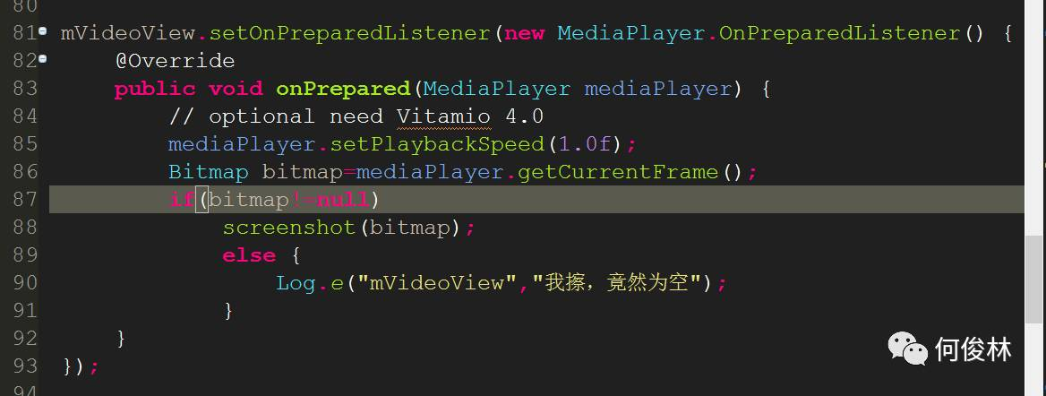 导入代码测试,这个框架好像将videoview封装了一层,叫mVideoview,据官网介绍,截图方法为getCurrentFrame();不过据博主测试,返回值为空。