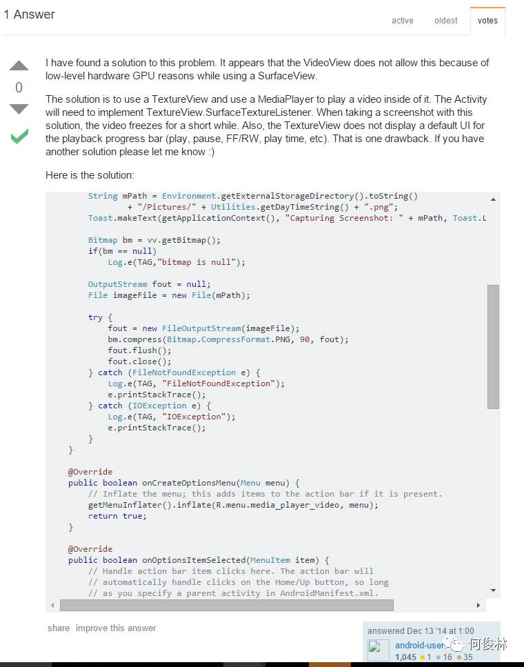 博主在度神上已经实在找不到方法了,博主打算去翻墙google一下,功夫不负有心人,老外也碰到了和博主一样的问题,博主找到了新的一个解决方案,那就是TextureView播放视频并截图,后来搜集了下情报,据说这玩意是2014年google搞出来的玩意。