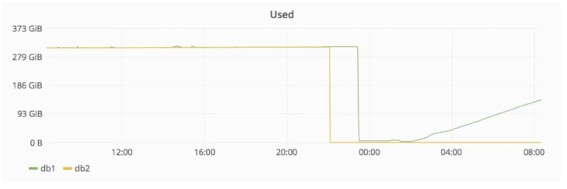 2017/01/31 23:27,运维工程师A停止了删除操作,但是一切都为时晚矣。原本300GB的数据只剩下4.5GB。