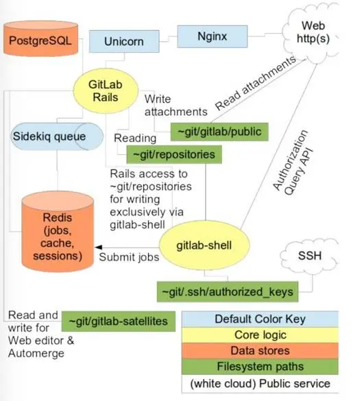 此次事件影响的是下图中的PostgreSQL(影响内容为项目、用户、问题、合并请求等存储在数据库中的信息,代码和wiki存储是单独存储在文件系统中,不受影响。