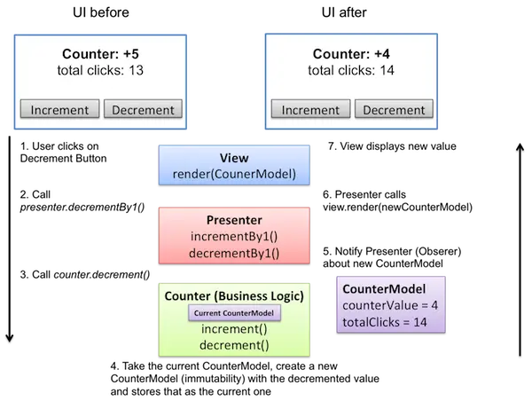 TextView 里。如果我们的 Model (在这个例子里,它就是计数的值,一个 int )是不可变的,那我们该怎么去计数?我很期待你的答案。按钮按下的时候,我们不会直接去操作 TextView 。一些已知条件是:第一,我们的 View 应当只有一个 view.render(...) 方法;第二,我们的 Model 不可变,所以不要想着直接去更改它;第三,只有一个数据源——业务逻辑。那就用按钮按下去的动作模拟业务逻辑。业务逻辑知道当前的 Model (比如,它持有一个当前 Model 的私有变量),而随着增/减操作,它可以根据上一个 Model 新建一个 Model 。