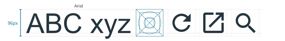 首先,先创建一个模板并制定好字体的尺寸。如下图所示,我是采用了96px 的文本尺寸,并配有相称的行高。然后,画出数条红线来标识文本行高及其基线的边界,以便分辨出最大的图标。当然在该例中,我还借鉴了 Google 的 Material 图标并引用其设计模板,去更好地理解如何构建属于自己的图标。
