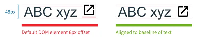 从该首例中,我们可以看到 DOM 元素默认情况下会与文本的基线(baseline)对齐。既然图标已经适配于该基线,那么,我们只需要把该基线往下移动,就能达到真正对齐的效果。因此,通过计算可以得出上述例子尺寸下的移动距离为 6px,或 6px/48px,即12.5%。同样,在第二个例子中,我们只需要把图标往下移动-0.125em 的位置,即能对齐文本的基线。