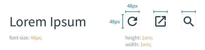 我们只需要引用一个 CSS 类对 SVG 的尺寸置为 1em / 1em 的大小,就能模拟使用 font-size 属性去缩放图标。这也就意味着,若标题文本的字体尺寸为 48px,那么对应之下 SVG 图标将会是 48px / 48px 的大小。当往像按钮或输入框这样的组件添加图标时,该方法显得尤为有效。此外,我们还可以通过修饰类或使用内联的 CSS 样式来给定一个字体尺寸。换而言之,SVG 图标的大小取决于其