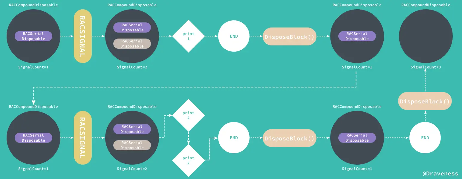 Original Signal Dispose.原订阅的销毁时间以及绑定信号的控制是由 SignalCount 控制的,其表示 RACCompoundDisposable 中的 RACSerialDisposable 实例的个数,在每次有新的订阅被创建时都会向 RACCompoundDisposable 加入一个新的 RACSerialDisposable,并在订阅发送结束时从数组中移除,整个过程用图示来表示比较清晰: