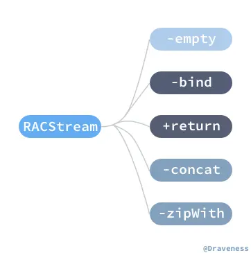 ReactiveCocoa 框架中借鉴了很多其他平台甚至语言中的概念,包括微软中的 Reactive Extension 以及 Haskell 中的 Monad,RACStream 提供的抽象方法中的 +return: 和 -bind: 就与 Haskell 中 Monad 完全一样。