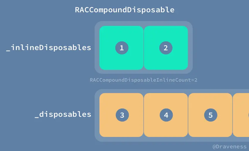 }在对象持有的 RACDisposable 不超过 RACCompoundDisposableInlineCount 时,都会存储在 _inlineDisposables 数组中,而更多的实例都会存储在 _disposables 中:
