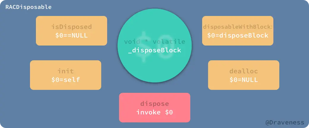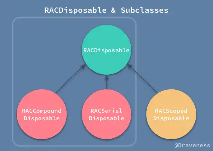 }在简化的代码中,订阅的清理是由一个 RACCompoundDisposable 的实例负责的,向这个实例中添加 RACSerialDisposable 以及 RACDisposable 对象,并在 RACCompoundDisposable 销毁时销毁。