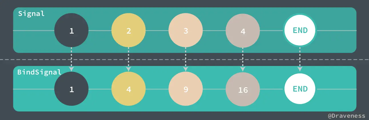 typedef RACSignal * _Nullable (^RACSignalBindBlock)(id _Nullable value, BOOL *stop);其函数签名可以理解为 id -> RACSignal,然而这种函数是无法直接对 RACSignal 对象进行变换的;不过通过 -bind: 方法就可以使用这种函数操作 RACSignal,其实现如下: