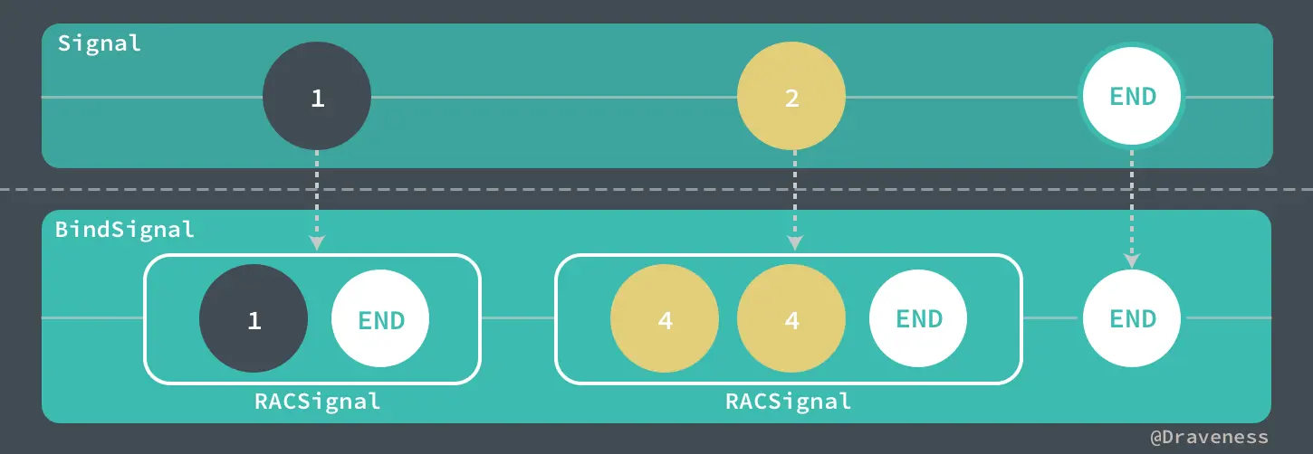 -bind: 方法会在原信号每次发出消息时,都执行 RACSignalBindBlock 对原有的信号中的消息进行变换生成一个新的信号: