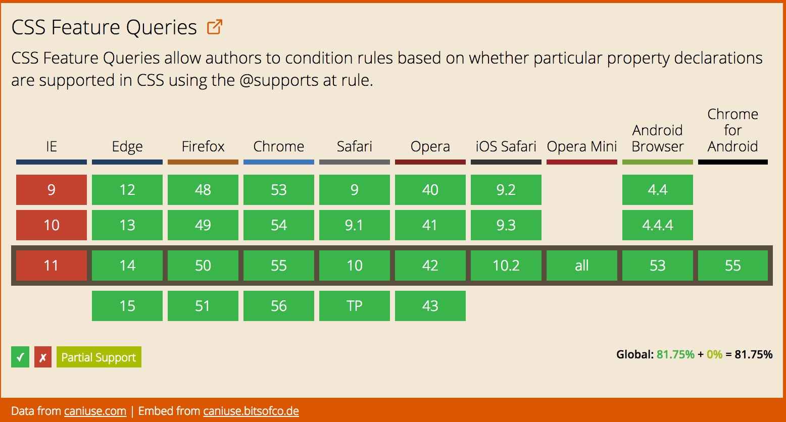不久前,我写过一篇关于特性查询的文章 —— 《一个我十分期待的CSS特性 - the one CSS feature I really want》。如今果然出现了。除了 IE浏览器之外,所有主流浏览器(包括 Opera Mini)均已支持特性查询。