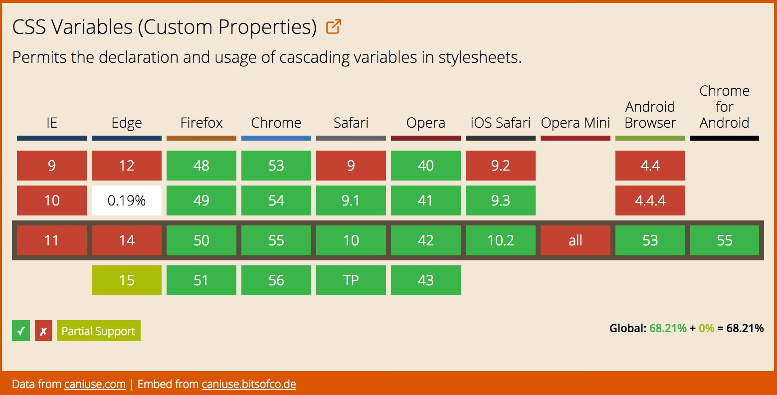 最后,原生 CSS 变量(层叠变量模块(Cascading Variables Module)的自定义属性)来了。该模块引入了一个用于创建用户自定义变量的方法,变量可被赋值给 CSS 属性。