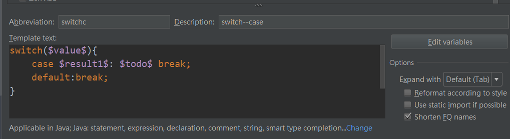 abbrevlation:模板的缩写,写代码时写缩写就会提示出来