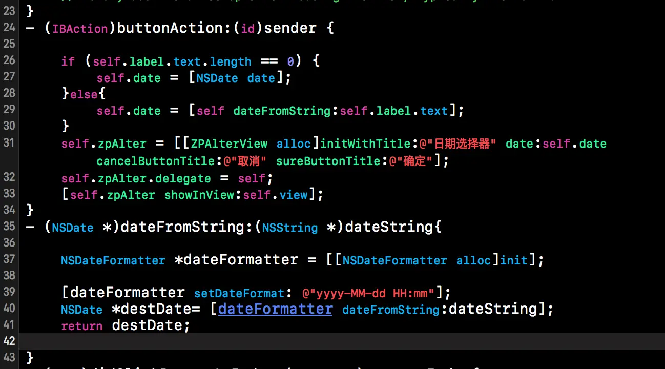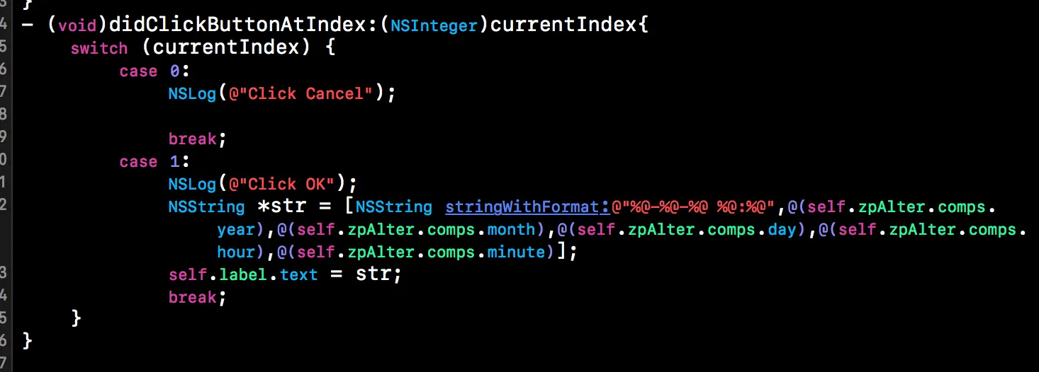 上面的 效果图也看到了,选择器下面有两个 button 那么 这个代理方法就是判断你点的是那个button,从而做出不同的处理。