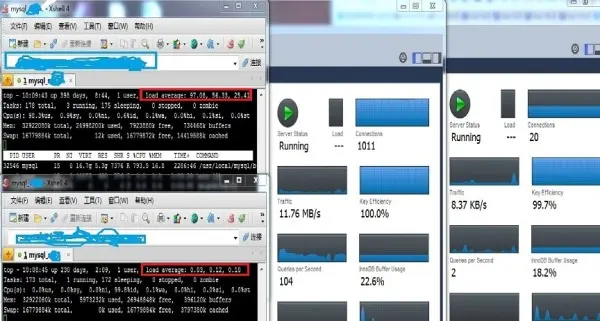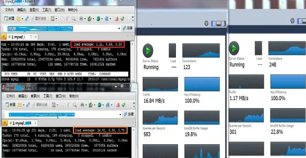 在抢标过程中继续观察,apache的连接数在抢标的时候仍然可以飙到2600-2800之间,根据客服反馈,仍然有很多用户反馈抢标的问题,但比之前稍微好一点,但是有零星的用户反馈已经抢到标的,最后又给回退了。然后继续观察数据库服务器,使用top命令和MySQLWorkbench查看mysql主库和从库的各项负载吓一跳(如下图),mysql服务器主库的各项指标均已经达到峰值,而从库几乎没有太大压力。