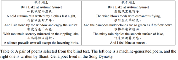 诗歌图灵测试:给定一个题目,让机器和人分别做一首诗 ,由人来区分哪首诗是人写的。实验结果也很有意思,对普通人来说,已经无法区分诗是由机器生成的还是人生成的,下面是一组测试的例子: