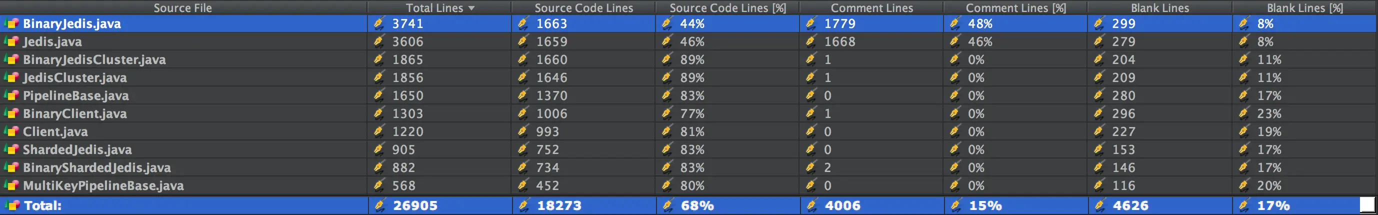上面提到Jedis的代码规模很大,进一步分析排名靠前的几个大类,可以发现两个明显的特点: