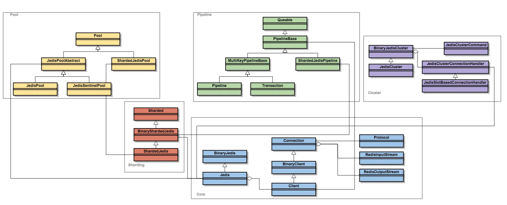 - Jedis/BinaryJedis: 入口类,封装Redis的各种命令。