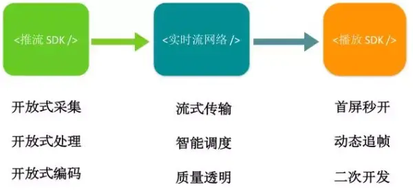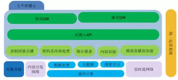 图 2 为七牛直播云的产品内核。它提供了三个端的 SDK:推流 SDK、服务端 SDK、播放端 SDK。其中,推流 SDK 控制视频流的采集、处理和编码,服务端 SDK 主要负责流的推流、传输和播放控制,播放端 SDK 负责视频流的解码和播放。