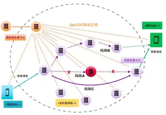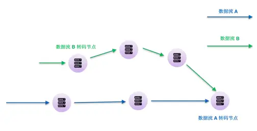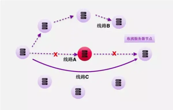 如图 6 所示,紫色表示收流节点,收流后通过一系列线路将流转发到另外一个节点。图 7 中所有节点都对等,节点选择遵循最优和就近原则。与传统 CDN 节点分层的网络架构不同,图中每个节点都可以进行收流、分流、转发,或者对流进行处理。图中假设,线路 A 经过的中间节点(红色)出现故障,那么调度中心会重新选择一条线路 (线路 C)进行传输。也可以使用线路 B 进行传输,只是线路 B 和线路 C 的传输路径较长,不符合最优和就近原则。