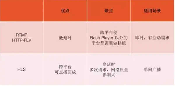 图 8 我们重点对比了 RTMP、HTTP-FLV 与 HLS协议的优缺点。如果我们更看重实时性,一般会选择 RTMP 或者 HTTP-FLV,因为它们能满足场景中较高的互动性需求。如果对跨平台有较高要求,则 HLS 是更好的选择。因为 RTMP 或者 HTTP-FLV 需要有一些特殊的支持,比如 Flash 播放器的支持,所以很难做成通用跨平台的。而 HLS 则相对比较通用,它基于 HTTP,数据分发基于传统 CDN,是将一个文件切成小片,之后不断更新其索引文件。因此,它的优点是对已有CDN 兼容性非常好,可以直接使用已有的 CDN 网络,缺陷是单向广播,互动性比较低,这样也导致了其延迟相对较大。