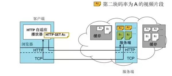 图 11 是一个非常简单的自适应播放模型,从图中我们可以看到视频播放器中自适应播放常用的三大模块,以及播放流程。播放流程如下:首先,服务端会将数据切成多个码率的视频文件并存储下来。然后,播放端向服务端发出请求获得 A 码率数据 ,服务端通过 HTTP 将 A 码率的数据传到客户端。客户端除请求外,还扮演了更多角色,首先它有一个带宽预估模块,即通过当前用户的带宽大小,及其可承受的视频码率大小进行带宽预估,后通过预估结果为用户选择相应的码率,并进行实时调整。选择码率后,通过下载调度模块实时调度当前码率,然后通过 HTTP 接口到服务端拉取数据,再将数据拉到播放端进行播放。接着,根据当前播放效果进行数据反馈。比如,拉一个 ts 片断所耗时长,通过计算平均拉取花费的时间,预估下一次拉取的数据大小。当然,图 12 中演示的是基于 HTTP 的自适应播放原理,实际上该原理和协议无关,基于 TCP 协议的播放也可以做到。只是无状态的 HTTP 更符合 CDN 分发的直觉,所以拿它来举例。